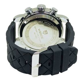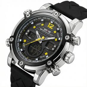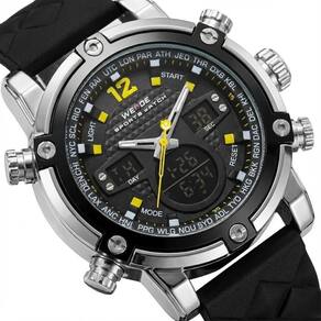 Relógio Masculino Weide AnaDigi WH-5205 Prata e Preto e AmareloMarca: Weide Categoria: AnaDigi Analógico: Sim (1 Horário) Ponteiros Fluorescentes: Selecione Digital: Sim (1 Horário) Despertador: Sim Mostra o Dia da Semana: Sim Mostra o Dia do Mês: Sim Cronômetro: Sim Luz: Sim Cor da Iluminação: VerdeResistente à Água: 3 ATM (Resiste a imersões breves) - Respingos: Sim - Chuva: Sim - Lavar Carro: Sim - Lavar Louça: Sim - Natação: Não - Mergulho: Não Característica do Vidro: Cristal Mineral Tipo de Fecho: Fivela Cor da Caixa: Prata Material da Caixa: Metal Banho IP Formato da Caixa: Redondo Diâmetro da Caixa: 49,50 (mm) Espessura da Caixa: 18,00 (mm) Cor da Pulseira: Preto Material da Pulseira: Silicone Largura da Pulseira: 23,50 (mm) Comprimento Máximo da Pulseira: 250,00 (mm) Alimentação: Bateria Interna Peso Líquido: 0,130 Kg Modelo: WH-5205 Cor Predominante: Prata Cor Diferencial: Preto e Amarelo Garantia: 12 MesesConteúdo da Embalagem: 01 Relógio 01 Embalagem 01 Termo de Garantia