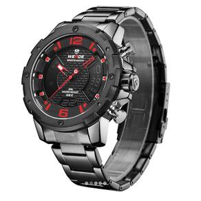 Relógio Masculino Weide AnaDigi WH8504B - Preto e Vermelho Relógio Masculino Weide AnaDigi WH8504B - Preto e Vermelho Marca: Weide Categoria: AnaDigi Analógico: Sim 1 Horário Ponteiros Fluorescentes: Sim Digital: Sim 1 Horário Calendário: Sim Despertador: Sim Mostra o Dia da Semana: Sim Mostra o Dia do Mês: Sim Cronômetro: Sim Contador Regressivo: Não Luz: Sim Cor da Iluminação: Verde Resistente à Água: 3 ATM Resiste a imersões breves - Respingos: Sim - Chuva: Sim - Lavar Carro: Sim - Lavar Louça: Sim - Natação: Não - Mergulho: Não Característica do Vidro: Cristal Mineral Tipo de Fecho: Dobrável com Botão e Trava Cor da Caixa: Preto Material da Caixa: Metal Banho IP Formato da Caixa: Redondo Diâmetro da Caixa: 46,80 mm Espessura da Caixa: 16,30 mm Cor da Pulseira: Preto Material da Pulseira: Metal Largura da Pulseira: 20,20 mm Comprimento Máximo da Pulseira: 230,00 mm Alimentação: Bateria Interna Peso Líquido: 0,161 Kg Modelo: WH8504B Cor Predominante: Preto Cor Diferencial: Vermelho : 12 Meses Conteúdo da Embalagem: 01 Relógio 01 Embalagem 01 Termo de Marca: Não Informado