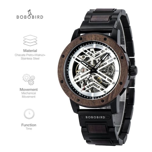 O relógio mecânico BOBO BIRD T108 é uma peça sofisticada e funcional que combina a elegância da madeira com a complexidade de um mecanismo automático. A seguir, apresento uma análise detalhada deste modelo: ### Design e Materiais - **Materiais**: O BOBO BIRD T108 é feito com uma combinação de madeira natural e aço inoxidável, o que lhe confere um visual único e elegante. As opções de madeira podem variar, incluindo madeiras como bambu, sândalo ou nogueira. - **Estilo**: O design do T108 é contemporâneo e elegante, com um mostrador que permite visualizar o mecanismo interno, agregando um toque de sofisticação e exclusividade ao relógio. ### Funcionalidades - **Resistência à Água**: Este modelo é resistente à água, o que significa que pode suportar salpicos e exposição breve à água, como lavar as mãos ou chuva leve. No entanto, não é indicado para natação ou mergulho. - **Movimento Mecânico**: O BOBO BIRD T108 é equipado com um mecanismo automático, o que significa que não necessita de bateria. O movimento é alimentado pelo movimento do pulso do usuário, destacando a engenharia e a tradição dos relógios mecânicos. ### Recursos Adicionais - **Mostrador**: O mostrador frequentemente apresenta um design "esqueleto", que permite ver o movimento mecânico interno. Marcadores luminosos e detalhes em aço inoxidável podem estar presentes para facilitar a leitura e adicionar ao design estético. - **Pulseira**: A pulseira é feita de madeira, proporcionando um ajuste confortável e seguro, geralmente com um fecho de aço inoxidável para durabilidade e segurança. ### Benefícios - **Estética Natural e Sofisticada**: A combinação de madeira e design mecânico oferece uma aparência distinta e eco-friendly, ideal para quem valoriza sustentabilidade e exclusividade. - **Conforto**: A leveza da madeira torna o relógio confortável para uso diário, sem sacrificar a durabilidade. ### Considerações - **Manutenção do Mecanismo**: Relógios mecânicos requerem manutenção regular para garantir que continuem funcionando corretamente. Isso pode incluir limpeza e ajustes periódicos por um profissional. - **Cuidado com a Água**: Embora seja resistente à água, a submersão prolongada ou exposição intensa deve ser evitada para preservar a integridade tanto do mecanismo quanto da madeira. ### Resumo O BOBO BIRD T108 é uma excelente escolha para quem busca um relógio mecânico que combine a elegância da madeira natural com a sofisticação de um mecanismo automático. Sua resistência à água o torna prático para uso diário, enquanto seu design único e a transparência do mostrador esqueleto adicionam um toque de luxo e exclusividade. Este relógio é ideal para quem aprecia a arte da relojoaria tradicional e um design eco-friendly.