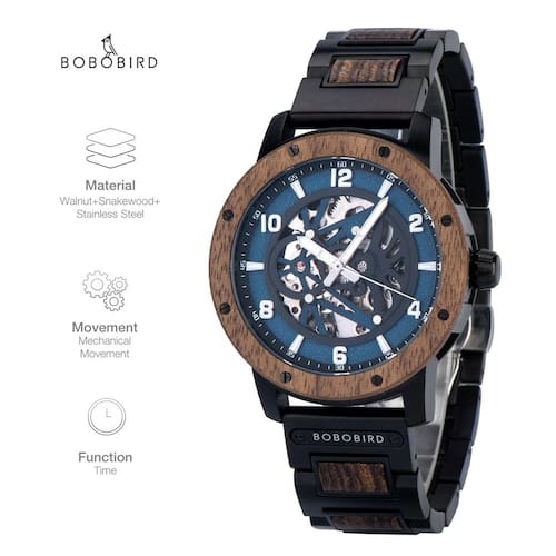 O relógio mecânico BOBO BIRD T108 é uma peça sofisticada e funcional que combina a elegância da madeira com a complexidade de um mecanismo automático. A seguir, apresento uma análise detalhada deste modelo: ### Design e Materiais - **Materiais**: O BOBO BIRD T108 é feito com uma combinação de madeira natural e aço inoxidável, o que lhe confere um visual único e elegante. As opções de madeira podem variar, incluindo madeiras como bambu, sândalo ou nogueira. - **Estilo**: O design do T108 é contemporâneo e elegante, com um mostrador que permite visualizar o mecanismo interno, agregando um toque de sofisticação e exclusividade ao relógio. ### Funcionalidades - **Resistência à Água**: Este modelo é resistente à água, o que significa que pode suportar salpicos e exposição breve à água, como lavar as mãos ou chuva leve. No entanto, não é indicado para natação ou mergulho. - **Movimento Mecânico**: O BOBO BIRD T108 é equipado com um mecanismo automático, o que significa que não necessita de bateria. O movimento é alimentado pelo movimento do pulso do usuário, destacando a engenharia e a tradição dos relógios mecânicos. ### Recursos Adicionais - **Mostrador**: O mostrador frequentemente apresenta um design "esqueleto", que permite ver o movimento mecânico interno. Marcadores luminosos e detalhes em aço inoxidável podem estar presentes para facilitar a leitura e adicionar ao design estético. - **Pulseira**: A pulseira é feita de madeira, proporcionando um ajuste confortável e seguro, geralmente com um fecho de aço inoxidável para durabilidade e segurança. ### Benefícios - **Estética Natural e Sofisticada**: A combinação de madeira e design mecânico oferece uma aparência distinta e eco-friendly, ideal para quem valoriza sustentabilidade e exclusividade. - **Conforto**: A leveza da madeira torna o relógio confortável para uso diário, sem sacrificar a durabilidade. ### Considerações - **Manutenção do Mecanismo**: Relógios mecânicos requerem manutenção regular para garantir que continuem funcionando corretamente. Isso pode incluir limpeza e ajustes periódicos por um profissional. - **Cuidado com a Água**: Embora seja resistente à água, a submersão prolongada ou exposição intensa deve ser evitada para preservar a integridade tanto do mecanismo quanto da madeira. ### Resumo O BOBO BIRD T108 é uma excelente escolha para quem busca um relógio mecânico que combine a elegância da madeira natural com a sofisticação de um mecanismo automático. Sua resistência à água o torna prático para uso diário, enquanto seu design único e a transparência do mostrador esqueleto adicionam um toque de luxo e exclusividade. Este relógio é ideal para quem aprecia a arte da relojoaria tradicional e um design eco-friendly.