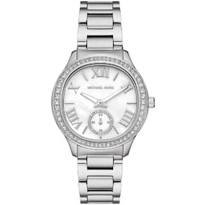 O Relógio Sage Pavé MK4807, um ícone de elegância atemporal. Com caixa de 38?mm em aço prateado, mostrador de madrepérola e bezel com cristais, ele exala sofisticação com discrição. A pulseira delicada em aço 18mm e o fecho de garantem conforto e estilo refinado.