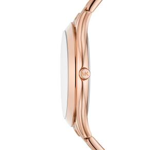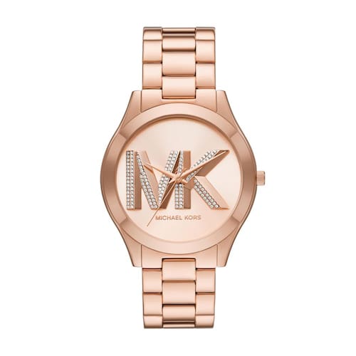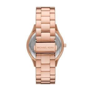 Michael Kors Relógio feminino Slim Runway, pulseira de aço inoxidável para mulheres, Logotipo ouro rosa, Pista fina - Michael Kors O relógio Slim Runway de 42 mm apresenta um mostrador pavé de ouro rosa, movimento de três ponteiros e pulseira de aço inoxidável em tom de ouro rosa. - Caixa e mostrador: caixa redonda de aço inoxidável de 42 mm com mostrador de ouro rosa; a face de cristal mineral resiste a arranhões - Pulseira de relógio: pulseira de aço inoxidável ouro rosa; largura da pulseira de 30 mm; elos podem ser removidos para um ajuste personalizado - Movimento: Movimento de quartzo com visor analógico de três pontos; importado - Resistente à água: até 50 m (165 pés): Vestível ao nadar em águas rasas; 5 ATM