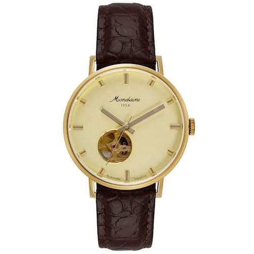 Parte da coleção comemorativa dos 70 anos da Mondaine, este modelo celebra a tradição e a qualidade da marca, trazendo o charme do maquinismo aparente no fundo e a icônica logo vintage de 1954, um toque de história em cada detalhe.