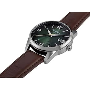 Mecanismo: Automático Miyoto Japan CWMJ Gênero: Masculino Visor: Prata Vidro: Safira Funções: Automático e Calendário Prova d'água: 50m Diâmetro da caixa: 40 mm Largura da pulseira: 18 mm Tamanho do Vidro: 36 mm Material da Pulseira: Couro Cor da Pulseira: Marrom Caracteristica: Fundo Rosqueado com detalhe de vidro que permite a visualização do maquinário
