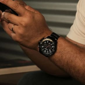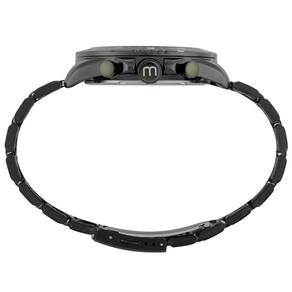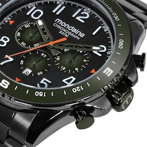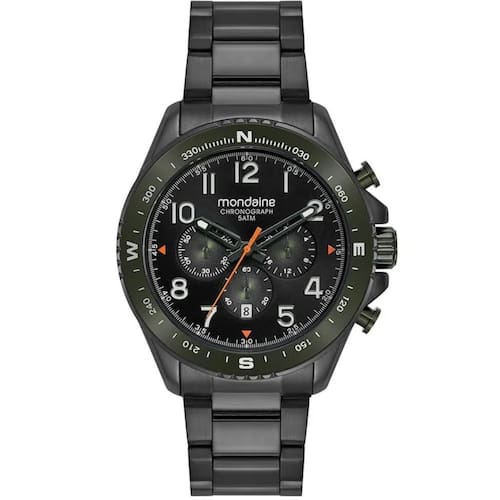Relógio Mondaine Cronógrafo 32895GPMVPE3 Com um visual moderno e impactante, este cronógrafo masculino da Mondaine aposta no contraste do acabamento preto fosco com a pulseira em aço preto, mantendo um estilo urbano e sofisticado. A caixa de 48 mm em metal proporciona presença no pulso, enquanto o mostrador escuro com números e indexes bem marcados favorece a leitura. Com fundo rosqueado, fecho de acionamento lateral e resistência à água de 5 ATM, é a escolha certa para quem busca funcionalidade sem abrir mão do design. Especificações Técnicas Mecanismo: Quartzo Gênero: Masculino Visor: dourado Vidro: Cristal Mineral Funções: Cronógrafo e Calendário Prova d'água: 50m Diâmetro da caixa: 48 mm Largura da pulseira: 22 mm Tamanho do Vidro: 37 mm : 12 meses pela fabricante Mondaine Ean: 7909669202974