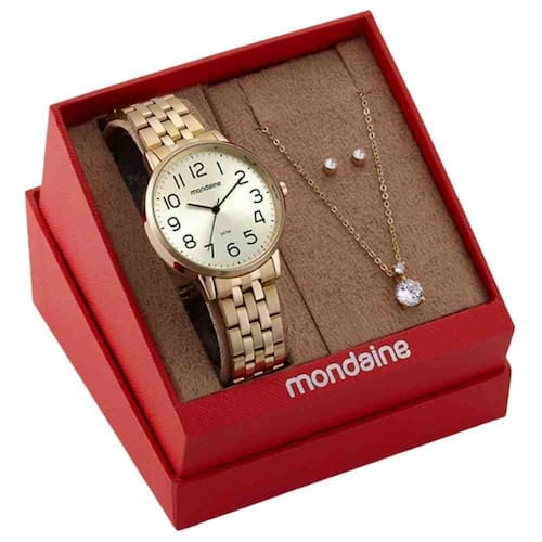 Kit Relógio Mondaine Dourado Feminino 32599Lpmkde1K1 O Kit Relógio Mondaine Dourado Feminino 32599Lpmkde1K1 é perfeito para quem busca elegância e sofisticação em um relógio de alta qualidade. A marca MONDAINE é conhecida mundialmente por seu design minimalista e elegante, conquistando fãs ao redor do mundo. Com uma tradição de mais de 70 anos em produzir relógios de alta qualidade, a MONDAINE é sinônimo de precisão suíça e materiais de alta qualidade. Este relógio feminino possui um belíssimo mostrador dourado, que confere um toque de glamour ao seu visual. Além disso, a pulseira também é dourada, feita em aço inoxidável, o que garante durabilidade e resistência. A largura da caixa é de 4 cm, proporcionando um tamanho ideal para o pulso feminino. A resistência à água deste relógio é de 5 ATM 50 metros , o que significa que você pode utilizá-lo em atividades do dia a dia, como lavar as mãos ou tomar um banho rápido. No entanto, não é recomendado utilizá-lo em mergulhos ou atividades aquáticas mais intensas. O Kit Relógio Mondaine Dourado Feminino 32599Lpmkde1K1 possui de 12 meses, o que demonstra a confiança da marca na qualidade do produto. Além disso, a Elister se preocupa com a qualidade em todos os seus produtos e serviços, oferecendo uma ampla variedade de acessórios, incluindo relógios e óculos de sol, das melhores marcas e estilos. A semijoia que acompanha o produto pode variar de acordo com a disponibilidade do e não está inclusa na . Compre o Kit Relógio Mondaine Dourado Feminino 32599Lpmkde1K1 e tenha um acessório elegante e sofisticado, perfeito para todas as ocasiões. Marca: Não Informado