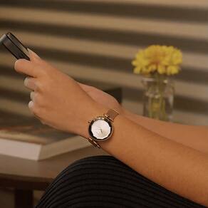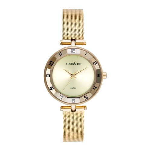 Características Formato do Relógio: Redondo Composição do Vidro: Cristal Mineral Material da Caixa: Aço Inox Cor da Caixa: Dourado Cor do mostrador: Dourado Material da Pulseira: Aço Inox Cor da Pulseira: Dourado Mecanismo: Analógico Quartz
