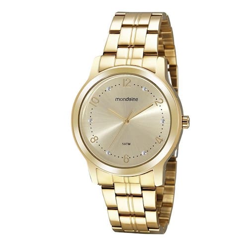 GêneroFeminino Garantia12 Meses Material da PulseiraAço Inox MecanismoAnalógico Resistência à ÁguaATM 5 Resistente à Água - 50M Tipo de EnergiaBateria AcompanhaCertificado de , Embalagem , Manual de Instrução, Espessura da Caixa1,0cm Aprox Largura da Caixa4,0cm Aprox Material da CaixaMetal MostradorDourado VidroCristal Mineral Marca.Mondaine Marca: Não Informado