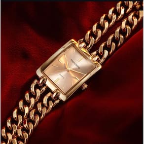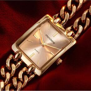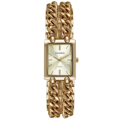 Relógio Mondaine Feminino Quadrado Corrente Dourado 32593LPMVDM1 Referência: 32593LPMVDM1 Acessório ideal para deixar a produção poderosa! Relógio analógico com folheação dourada, caixa retangular em metal, e visor na cor champanhe com marcação completa. Conta com pulseira sólida de corrente com fecho joalheria. Super fashion, oferece um caimento perfeito para pulsos menores e médios. Esse relógio possui a caixa com 2,2 X 2,4 cm de tamanho. Especificações ATM - Pressão Máxima 3 ATM Altura 9 mm Comprimento Do Relógio 21 cm Número Elos Removíveis 6 Alarme Não Tamanho Da Caixa 22x34 mm Tamanho Do Vidro 22 mm Garantia 1 Ano Largura Da Pulseira 20 mm Saiba o tamanho ideal para você: Relógio Feminino Até 35 mm: Pulso P De 36 a 38 mm: Pulso M De 39 a 40 mm: Pulso G Acima de 40 mm: Pulso GG