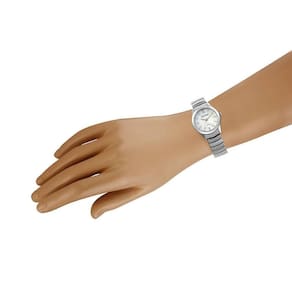 Caixa de Metal Pulseira de Aço Mola Vidro de Cristal Mineral Fundo Rosqueado Resistente à Água 5 Atm Diâmetro / Largura da Caixa: 28.00 MM Função: Analógico Alimentação do Maquinário: Bateria Mostrador Estilo Madreperola Branco com número Garantia de 1 Ano Ean: 7909669105084