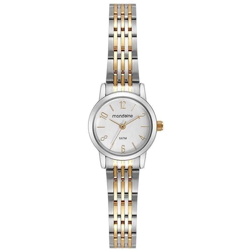 Relogio Mondaine Feminino Ref: 32492lpmvbe2 Social Pequeno Bicolor DESCRIÇÃO DO PRODUTO: Caixa de Metal Pulseira de Aço Vidro de Cristal Mineral Fundo Rosqueado Resistente à Água 5 Atm Diâmetro / Largura da Caixa: 23.00 MM Função: Analógico Alimentação do Maquinário: Bateria Mostrador Prateado com númerosPrateado com Dourado Garantia de 1 Ano
