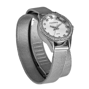 Caixa de Metal Pulseira de Malha de Aço Mesh Longa Para dar duas voltas no braço Vidro de Cristal Mineral Fundo Rosqueado Resistente à Água 5 Atm Diâmetro / Largura da Caixa: 24.00 MM Função: Analógico Alimentação do Maquinário: Bateria Mostrador Prateado com Pedras Garantia de 1 Ano