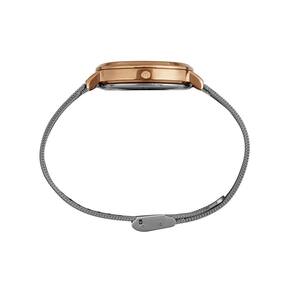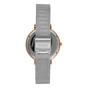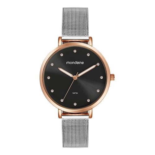 Caixa de Metal Pulseira de Malha de Aço Mesh Vidro de Cristal Mineral Fundo Rosqueado Resistente à Água 5 Atm Diâmetro / Largura da Caixa: 36.00 MM Função: Analógico Alimentação do Maquinário: Bateria Mostrador Preto com Pedras Prateado com Rosé Garantia de 1 Ano