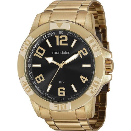 O Relógio Mondaine Masculino 99369GPMVDE3 possui mecanismo Analógico, a pulseira é na cor Dourado, fabricada em Aço. A Caixa (peça onde fica o mostrador) é fabricada em Metal, mede 48mm de diâmetro, sem considerar a coroa.