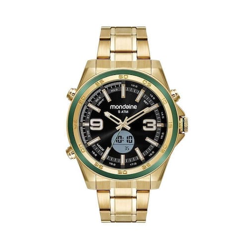 Formato da CaixaRedondo MarcasMondaine GêneroMasculino CorDourado Tamanho da CaixaGrande Material da PulseiraAço MecanismoAnadigi Comprimento do Relógio26 cm Pulseira AjustávelSim Material da CaixaMetal Espessura da Caixa1,5 cm Dimensões da Caixa4,8 cm de diâmetro Material do VidroCristal Mineral Nível de Resistência à Água5 ATM CalendárioCalendário Digital CronômetroCronômetro Digital AlarmeUm Alarme Diário Timer Contador Regressivo Não Possui Timer Função Chime Bip de Horas Aviso de Hora Cheia Função Chime Iluminação NoturnaIluminação de Fundo FornecedorSeculus da Amazônia Indústria e Comércio SA. CNPJ: 34.516.088/0001-10 Prazo de GarantiaGarantia de 1 Ano com o Fornecedor O que Acompanha o ProdutoCerificado de Garantia do Fabricante Manual em Português Ean: 7909669151562