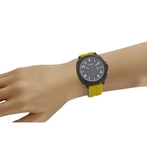 O funcionamento é Analogico com calendario, Pulseira de Silicone na cor AMARELO, fecho de Fivela, caixa de Metal e resistencia de 5 ATM.