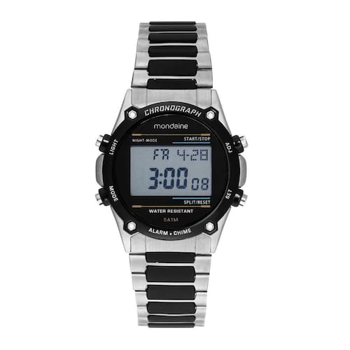 Relogio Mondaine Masculino Ref: 32812g0mvnf2 Digital Vintage Bicolor DESCRIÇÃO DO PRODUTO: Caixa de Metal prateada com detalhes em Preto Pulseira de Aço Com Detalhes em Poliuretano Preto Vidro de Cristal Mineral Fundo Resistente à Água 5 Atm Diâmetro / Largura da Caixa: 42.00 MM Função: Digital, Dual Time, Alarme com soneca, Cronômetro, Timer, Iluminação Estilo Retrô, Vintage Alimentação do Maquinário: Bateria de 1 Ano Marca: Não Informado Ean: 7909669180463