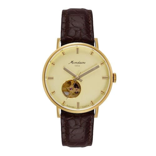 Relogio Mondaine Masculino Ref: 32850gpmvdc1 Automático Semiesqueleto Dourado DESCRIÇÃO DO PRODUTO: Caixa de Aço Inoxidável Pulseira de Couro Marrom Vidro de Safira Fundo Rosqueado com detalhe de vidro que permite a visualização do maquinário Resistente à Água 5 Atm Diâmetro / Largura da Caixa: 38.00 MM Altura da Caixa: 12.00 MM Função: Automático Semiesqueleto Olho mágico Mostrador Dourado com Inscrição Mondaine 1954 Logo Clássica da marca e detalhe que permite a visualização de parte do maquinário em funcionamento Pulseira com Fecho Oculto Coleção Especial Mondaine 70 Anos Alimentação do Maquinário: Mecânico Automático Movimento Japonês de 1 Ano