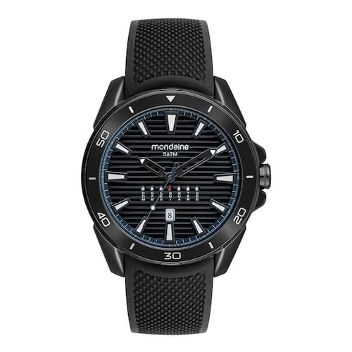 Relogio Mondaine Masculino Ref: 32896gpmvpi2 Esportivo Black DESCRIÇÃO DO PRODUTO: Caixa de Metal Pulseira de Silicone Preta/Cinza Vidro de Cristal Mineral Fundo Rosqueado Resistente à Água 5 Atm Diâmetro / Largura da Caixa: 48.00 MM Função: Analógico, Calendário Duplo Dia da Semana e Dia do Mês Mostrador Preto Aro Fixo Preto Alimentação do Maquinário: Bateria de 1 Ano Marca: Não Informado