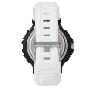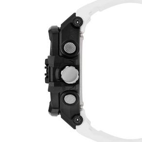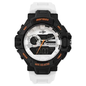 Relógio Mormaii Action com modulo anadigi e caixa de polímero na cor preta fazendo contraste com a pulseira de polímero branca. É um relógio esportivo, que te deixa pronto para qualquer desafio. Ele tem resistência à água de 100 metros e caixa de polímero que, mesmo robusta, é leve e confortável. O aro externo com detalhes em relevo e as funções de calendário, cronógrafo e alarme completam o time.