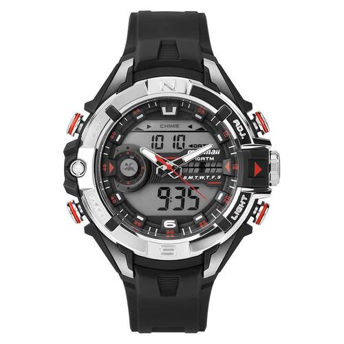Relógio Action, que conta com caixa de polímero e pulseira de poliuretano na cor preto, aro na cor prata, e mostrador com display de LCD positivo. Além disso, ele apresenta indicador diário, mensal e semanal, aviso sonoro de hora em hora, temporizador, alarme, cronômetro, segunda zona de horário e luz noturna para auxílio em ambientes escuros. Com resistência à água de 100 metros, é o relógio ideal para te acompanhar em qualquer momento.