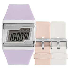 Características Formato do Relógio: Retangular Composição do Vidro: Acrílico Material da Caixa: Resina Cor da Caixa: Branco Cor do mostrador: Digital Material da Pulseira: Borracha Cor da Pulseira: Branco, Rosê, Roxo Mecanismo: Digital