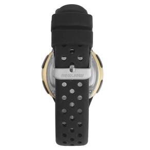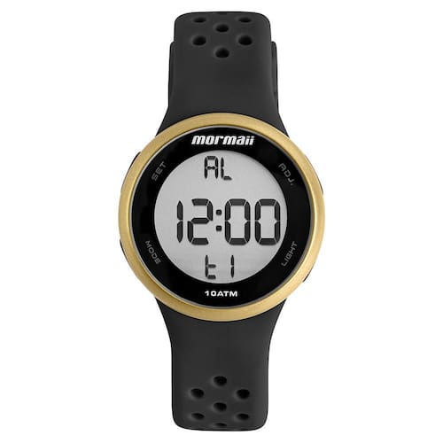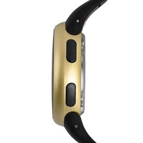 O diferencial fica por conta do aro dourado, que contrasta com a pulseira preta em silicone texturizado, proporcionando um visual esportivo com toque fashion. O visor digital com LCD positivo permite fácil leitura das funções: hora, calendário, alarme, cronômetro, cronógrafo e iluminação noturna.