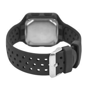 A pulseira de silicone preto, além de leve e confortável, possui acabamento perfurado que garante melhor ventilação para a pele durante o uso prolongado, ideal para rotinas ativas e esportivas. O modelo ainda apresenta botões laterais em aço e fecho fivela ajustável, oferecendo firmeza e segurança no pulso.