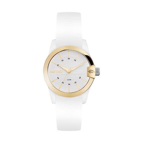 O diferencial está na moldura dourada com detalhe exclusivo do logo Mormaii sobre a coroa, que adiciona personalidade ao design clean. A pulseira em silicone branco traz conforto e versatilidade para o uso diário, enquanto a resistência à água de 5 ATM permite o uso em atividades leves com contato com a água.