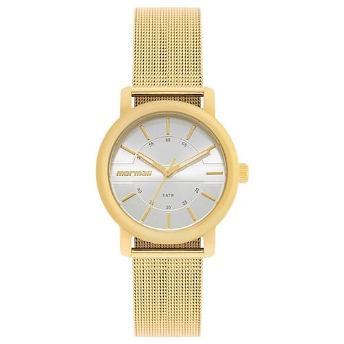 Com caixa em aço inoxidável dourado de 32mm, o relógio apresenta um mostrador prateado com marcadores e ponteiros dourados, proporcionando um visual limpo e refinado. A pulseira mesh em aço dourado complementa o design com toque de leveza e conforto, ajustando-se perfeitamente ao pulso.