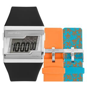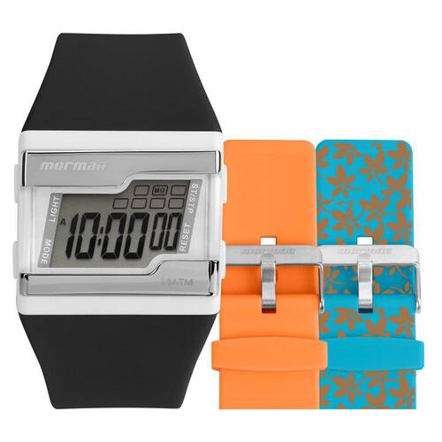 Características Formato do Relógio: Retangular Composição do Vidro: Acrílico Material da Caixa: Resina Cor da Caixa: Branco Cor do mostrador: Digital Material da Pulseira: Borracha Cor da Pulseira: Estampado, Laranja, Preto Mecanismo: Automático-Mecânico