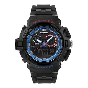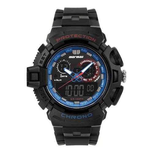Características Formato do Relógio: Redondo Composição do Vidro: Acrílico Material da Caixa: Resina Cor da Caixa: Preto Cor do mostrador: Azul, Digital, Vermelho Material da Pulseira: Borracha Cor da Pulseira: Preto Mecanismo: Analógico-Digital