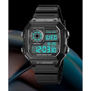 Relógio multifuncional quadrado: hora dupla, dia-data-mês, cronômetro de 1/100 segundo, contagem regressiva e alarme multifuncional