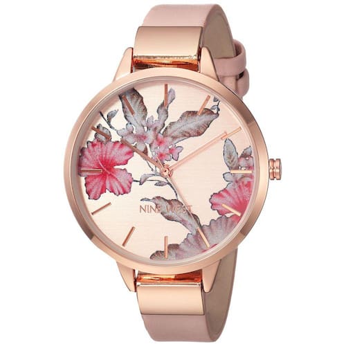 Lente de cristal mineral; mostrador texturizado em tom de ouro rosa claro com design floral impresso em 3D; ponteiros e marcadores em tom de ouro rosa