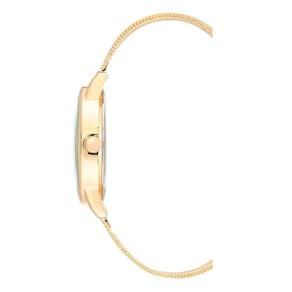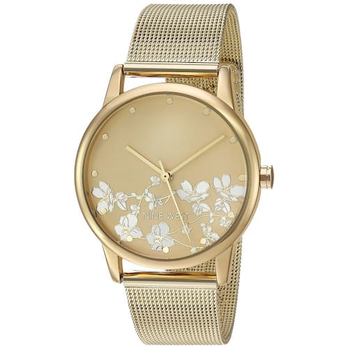 Relógio feminino Nine West com pulseira de malha floral — lente abobadada de cristal mineral — Mostrador fosco champanhe claro com design floral; ponteiros e marcadores dourados — Pulseira de malha dourada com fivela deslizante ajustável — Não resistente à água