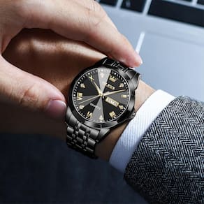 Relógios pretos OLEVS para homens Relógio de pulso analógico de rosto grande Número Romano Relógios masculinos de pulso grande com pulseira de aço inoxidável com data, mãos luminosas resistentes à água, relógio masculino Reloj de Hombre - [Design elegante e moderno] ? Movimento de quartzo de alta qualidade, ponteiros dourados luminosos e mostrador analógico preto conferem um apelo clássico a este relógio masculino. É ideal para usar, desde conjuntos casuais e descolados até peças separadas prontas para o escritório. - [Mostrador com número romano] ? Este relógio tem números romanos dourados e o mostrador faz com que as horas de diamante apareçam — brilho suficiente para manter as pessoas interessadas sem ser nem um pouco ostensivo. Uma janela de data diurna às 3 horas significa que você nunca esquecerá aniversários e datas comemorativas. - [Pulseira de aço inoxidável premium] ? A caixa e a pulseira de aço inoxidável altamente polido incorporam uma superfície simples que permite que o relógio brilhe e brilhe de todos os ângulos, além de proporcionar conforto no pulso. Forneça ferramentas de ajuste gratuitas para ajustar a pulseira em casa. - [Presentes perfeitos] ? Todo homem perspicaz precisa de um relógio que seja igualmente elegante e sofisticado. É o presente preferido para pai, marido, filho, irmão, namorado, amigo e muito mais. Perfeito para o Dia dos Namorados, aniversários, Dia dos Pais, Natal e outros eventos. - ? O que você ganha: relógio simples masculino OLEVS, garantia de devolução do dinheiro em 30 dias, nossa garantia de 12 meses sem preocupações e atendimento ao cliente amigável. ? Resistente à água até 100 pés (30 m), adequado para uso diário. Não é adequado para tomar banho, nadar, mergulhar e outros trabalhos relacionados à água.