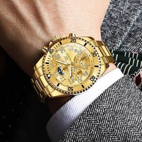 Relógio masculino dourado com cronógrafo, moderno, fase da lua, grande, aço inoxidável, à prova d'água, luminoso, negócios, reloj para hombre