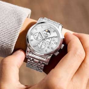OLEVS Relógios masculinos prateados, luxuosos, analógicos, fases da lua, relógio casual para homens, multifuncional, clássico, negócios, aço inoxidável, à prova d'água, luminoso, calendário, relógio de pulso - Relógio masculino OLEVS Luxuoso: este relógio masculino OLEVS é um relógio de mostrador grande com um diâmetro de caixa de 41,5 mm / 1,63 polegadas, circunferência máxima: 210 mm / 8,26 polegadas, este relógio cronógrafo multifuncional combina com roupas de negócios, dando um visual cavalheiro. Movimento importado, fornece horário preciso e preciso. Lente de vidro cristal, caixa e pulseira de aço inoxidável, durável e confortável para uso diário - Relógio multifuncional para homens: design clássico de 7 mostradores manuais, 5 funções de tempo meticulosamente projetadas para atender OLEVS todas as necessidades do cliente, um relógio multifuncional com várias vezes. Pulseira de relógio de aço inoxidável sólida, botão de borboleta oculta, ventilar, evitar transpiração, garantia de qualidade. Vem como um bônus de ferramentas de ajuste fornecidas para ajustar facilmente o comprimento da pulseira - Relógio de pulso à prova d'água/luminoso: resistente à água até 30 m, pode suportar respingos ou breve imersão em água, mas não é adequado para nadar ou tomar banho. Após forte exposição à luz, a função luminosa do relógio pode ser ativada, permitindo que você cronometre com precisão mesmo em ambientes escuros - Presente perfeito para relógio: este relógio de pulso de luxo elegante pode ser utilizado em uma variedade de ocasiões, seja formal, comercial ou casual, ou em eventos internos, externos ou uso diário. Embalado em uma caixa requintada, este relógio elegante e luxuoso é um presente ideal para você, amigos, colegas de classe, amantes, família para formaturas, Natal, aniversários, dia dos pais, dia dos namorados, etc - Serviço pós-venda: cada relógio de pulso tem serviço de vendas. Se você tiver alguma dúvida sobre o produto, comigo imediatamente e lhe daremos uma solução satisfatória