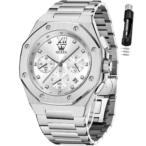 OLEVS Relógios masculinos prateados com cronógrafo, vestido luxuoso, multifuncional, aço inoxidável, quartzo, à prova d'água, calendário, Relojes De Hombre