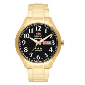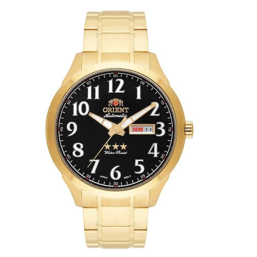 Automatico Gênero: Masculino Visor: Preto Vidro: Cristal Mineral Funções: Calendário Duplo Pressão: 50m Características: com caixa em Aço+Dourado e pulseira em Aço+Dourado Diâmetro da caixa: 47 mm