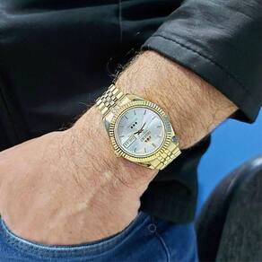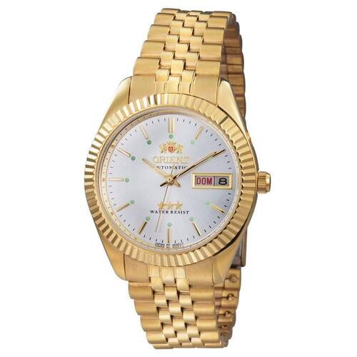 Mecanismo: Máquina com movimento automático (mecânico) Gênero: Masculino Visor: Dourado Vidro: cristal mineral Funções: calendário duplo Prova d'água: 30m Características: com caixa em aço inoxidável e pulseira em aço inoxidável Diâmetro da caixa: 38 mm