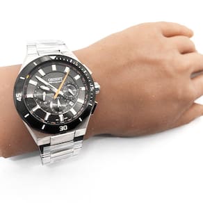 Características Formato do Relógio: Redondo Composição do Vidro: Cristal mineral Material da Caixa: Aço Inox Cor da Caixa: Prata Cor do mostrador: Cinza Material da Pulseira: Aço Inox Cor da Pulseira: Prata Mecanismo: Analógico Multifunção