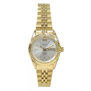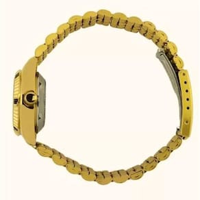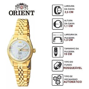 CARACTERÍSTICAS:Mostrador redondo analógico na douradoPulseira em aço na cor douradoFecho de pressãoVidro crystal21 JewelsMostrador fundo prateadoÀ prova d'água, suporta 3 atm ou 30 metros de pressãoMecanismo de funcionamento automáticoCorda por movimento e na coroaMedidas da caixa:- 25 mm de largura sem a coroa- 27 mm de largura com a coroa- 31 mm de altura da caixa- 11 mm de espessura da caixaPeso: 51 gramas