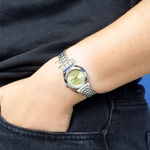 Marca: Orient Modelo: 559WA1NH C1SX Tipo de relógio: Analógico Gênero: Feminino Cor da caixa: Prateado Cor da pulseira: Prateado Estilo: Casual Alarme: Não Cronômetro: Não Calendário: Sim Luz: Não – ponteiros fluorescentes Resistência à água: Sim – rotinas diárias Tipo de fecho: Dobrável Material da caixa: Aço Inoxidável Material da Pulseira: Aço Inoxidável Características do vidro: Cristal Mineral Tamanho da caixa: 25 mm Espessura da caixa: 11 mm Comprimento da pulseira: 21 cm Largura da pulseira: 10 mm Tampa do fundo: Rosqueado Peso: 49 Gramas Alimentação: Automático Garantia do Fabricante: 12 meses Fabricante: Orient Relógios da Amazônia LTDA