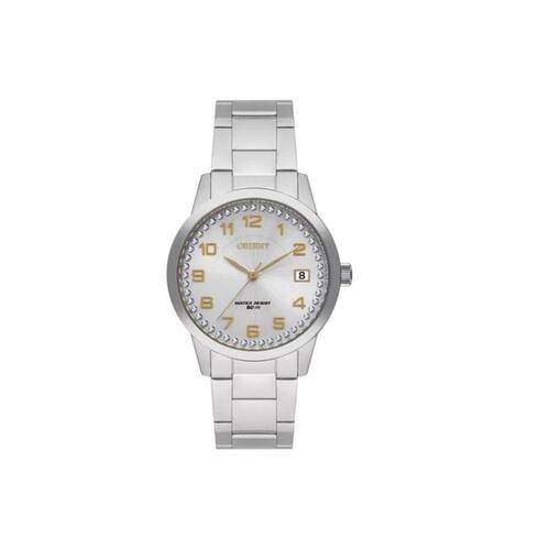 Relogio Orient feminino prata dourado com numeros strass calendario de aço inox FBSS1192 S2SX