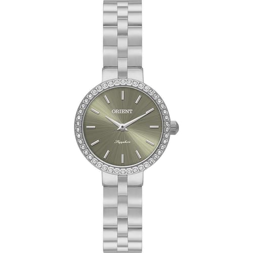 Relógio Orient Feminino Ref: Fbss0149 E1sx Social Prateado DESCRIÇÃO DO PRODUTO: Caixa: Aço Pulseira: Aço Medida da caixa: 24MM Vidro: Safira Alimentação do maquinário: Bateria Resistência à água: 30 m Funções: Analógico Mostrador Verde Aro Externo com Pedras Fundo de 1 ano