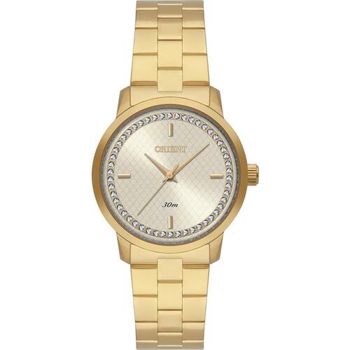 Relógio Orient Feminino Ref: Fgss0239 C1kx Casual Dourado DESCRIÇÃO DO PRODUTO: Caixa: Aço Pulseira: Aço Medida da caixa: 32MM Vidro: Cristal Mineral Alimentação do maquinário: Bateria Resistência à água: 30 m Funções: Analógico Mostrador Dourado com Pedras Fundo de 1 ano Marca: Não Informado Ean: 7891529268810