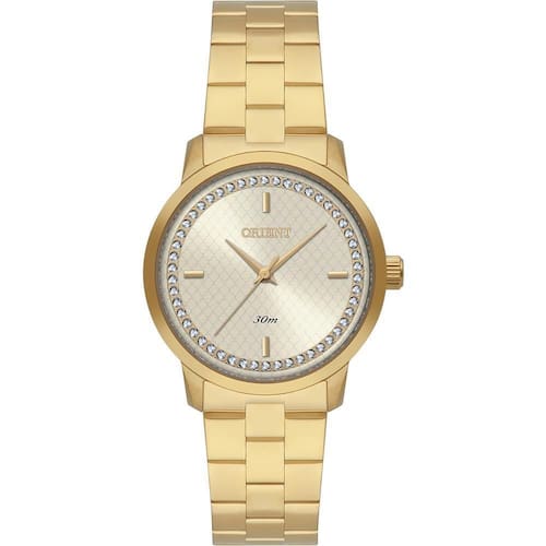 Relógio Orient Feminino Ref: Fgss0239 C1kx Casual Dourado DESCRIÇÃO DO PRODUTO: Caixa: Aço Pulseira: Aço Medida da caixa: 32MM Vidro: Cristal Mineral Alimentação do maquinário: Bateria Resistência à água: 30 m Funções: Analógico Mostrador Dourado com Pedras Fundo de 1 ano Marca: Não Informado