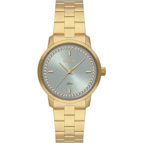 Relógio Orient Feminino Ref: Fgss0239 F1kx Casual Dourado DESCRIÇÃO DO PRODUTO: Caixa: Aço Pulseira: Aço Medida da caixa: 32MM Vidro: Cristal Mineral Alimentação do maquinário: Bateria Resistência à água: 30 m Funções: Analógico Mostrador Verde com Pedras Fundo de 1 ano Marca: Não Informado