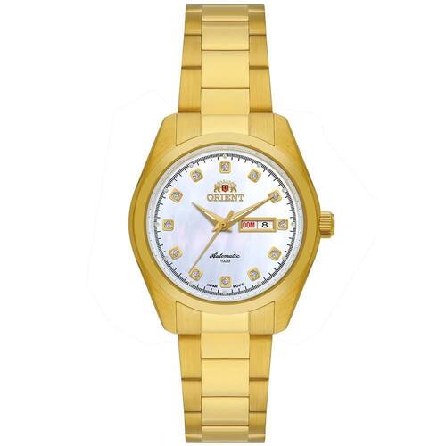 Vidro: cristal mineral Funções: automático, analógico, calendário duplo com opção em espanhol e inglês Resistência à água: 100m Características: com caixa em aço e pulseira em aço Diâmetro da caixa: 32 mm Mecanismo japonês Alimentação do maquinário: mecânico, automático Fundo rosqueado Mostrador madreperola branca com pedras
